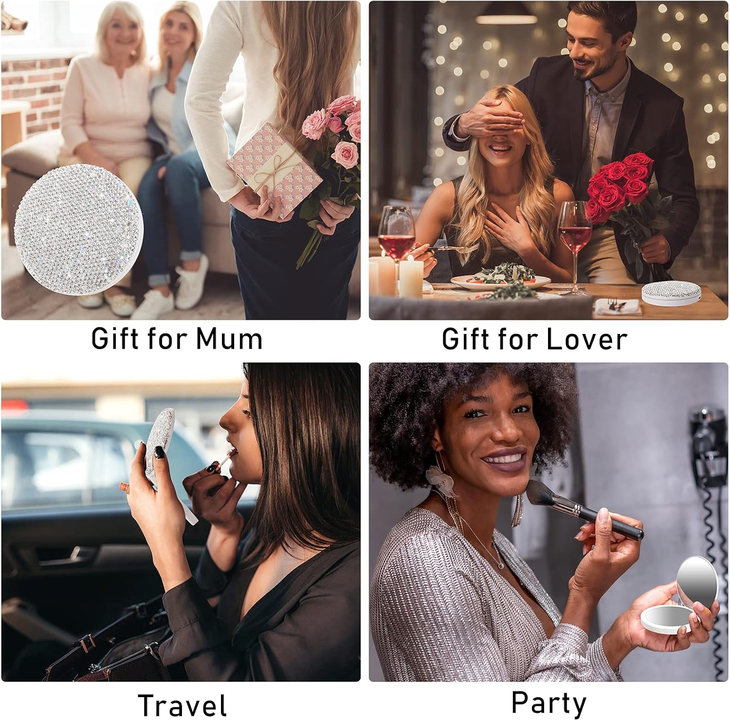 ·【Bling Bling Fashionable Compact Mirror】Love anything that blings and sparkles? Looking for a rose gold or a jeweled gift? This fashionable bling diamond compact mirror would be your perfect choice! Featuring the crystal clear AB rhinestone, this absolutely adorable pocket mirror is highly reflective, giving them a sparkling shimmer with maximum luster. 6 styles different shaped shiny AB rhinestones are firmly paste by handcraft on the top of the mirror.
